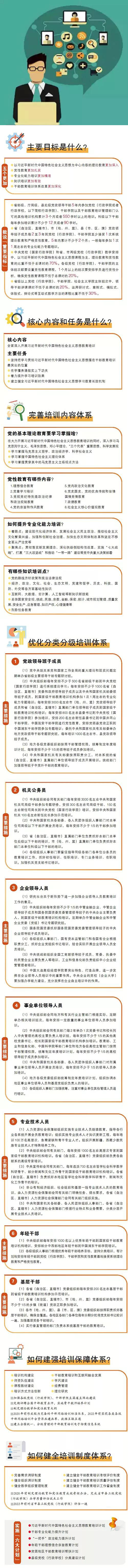 中共中央印发了《2018-2022年全国干部教育培训规划》。《规划》是新时代加强和改进干部教育培训工作的重要依据,对于贯彻落实新时代党的建设总要求和新时代党的组织路线、培养造就忠诚干净担当的高素质专业化干部队伍、确保党的事业后继有人,具有重大而深运的意义。为方便大家学习贯彻《规划》的主要精神和内容,图解版,更加清晰,一目了然!