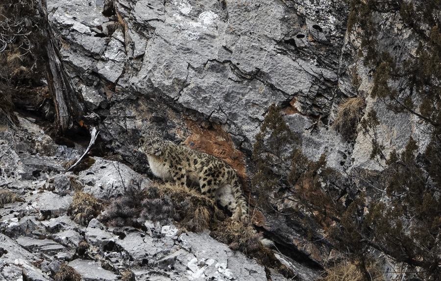 2023年2月21日,在青海省玉树藏族自治州杂多县昂赛乡境内的昂赛大峡谷内,一只雪豹准备向上攀爬。