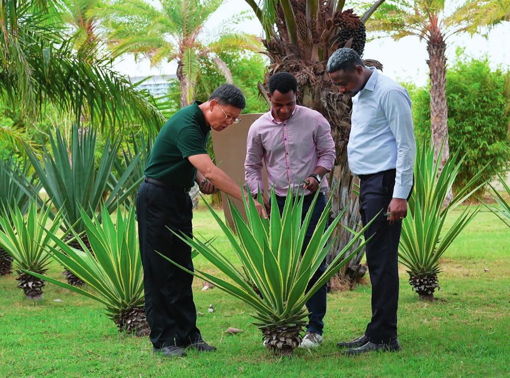 在三亚崖州湾科技城,非洲留学生跟随中国热带农业科学院研究员易克贤(左一)在观察剑麻育种材料长势