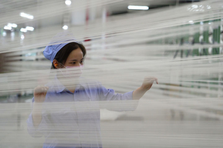 工作人员在位于河南省平顶山市的中国平煤神马集团帘子布发展公司布机车间检查丝线情况