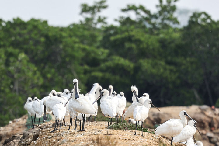 一群黑脸琵鹭在海南新盈红树林国家湿地公园休憩
