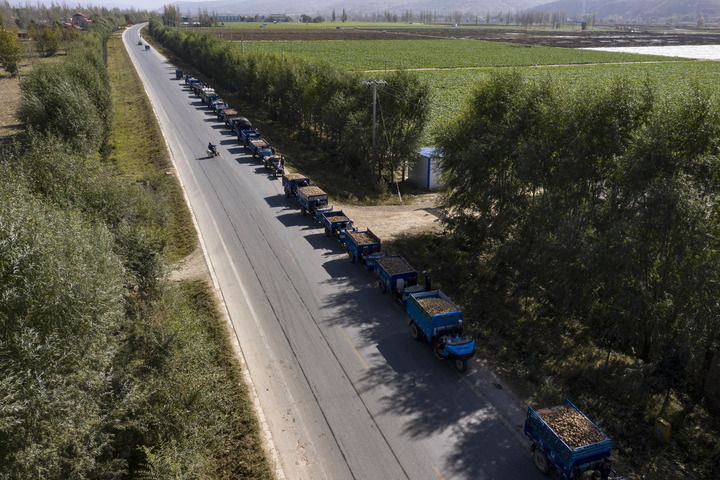 交售马铃薯的农用车在宁夏固原市西吉县马莲乡一家淀粉厂门前排起长队