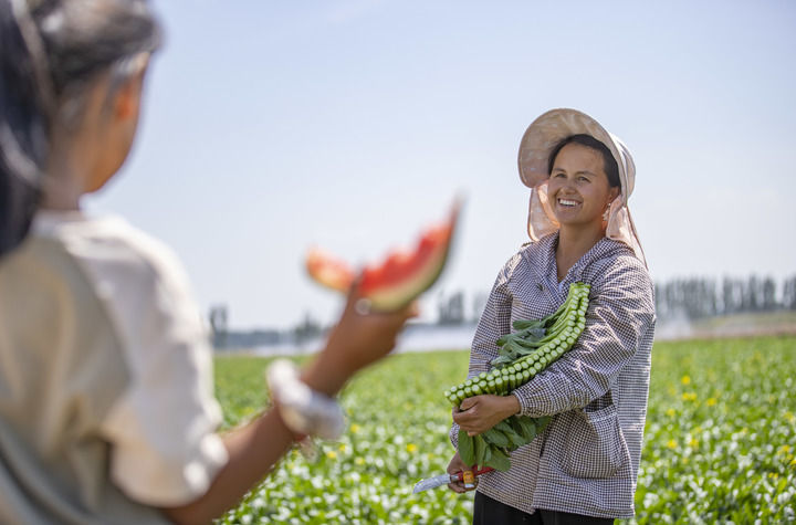 在宁夏青铜峡市瞿靖镇毛桥村蔬菜基地,来自贵州的苗族务工人员杨文高(右)在采收间隙和女儿聊天