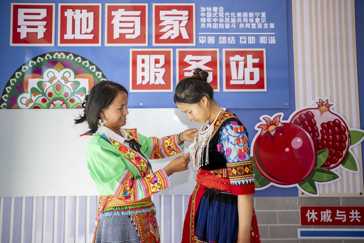在宁夏青铜峡市瞿靖镇毛桥村“异地有家”服务站,来自贵州的苗族务工人员杨文高(左)在给放暑假的大女儿整理服饰。杨文高将民族服饰从老家带到宁夏,在工作之余就会穿上民族服饰