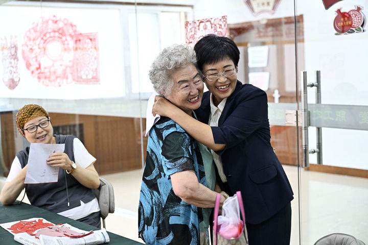 宁夏银川市金凤区长城花园社区居民在社区“才艺堂”制作剪纸