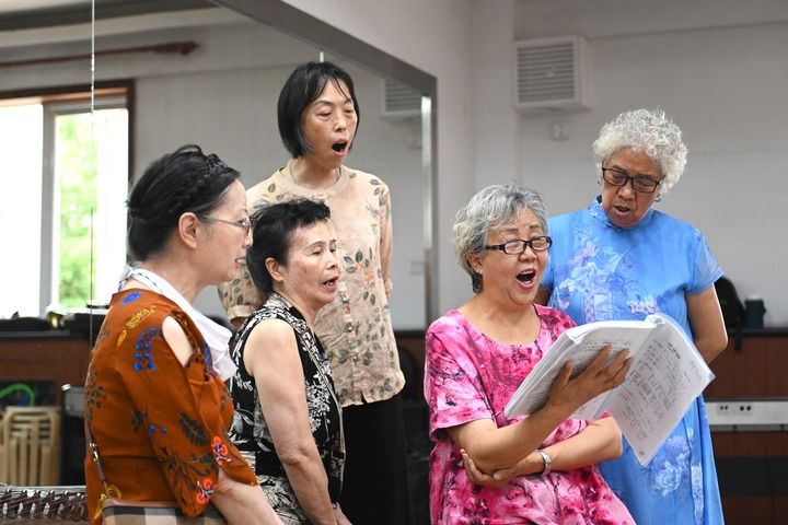 宁夏银川市金凤区长城花园社区居民在活动室排练节目