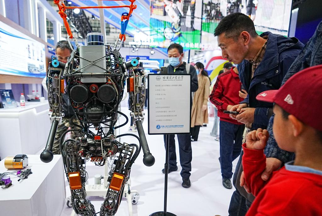 2024年5月19日,在第八届中俄博览会新质生产力科技成果展区,参会者在了解哈工大液压人形机器人系统。