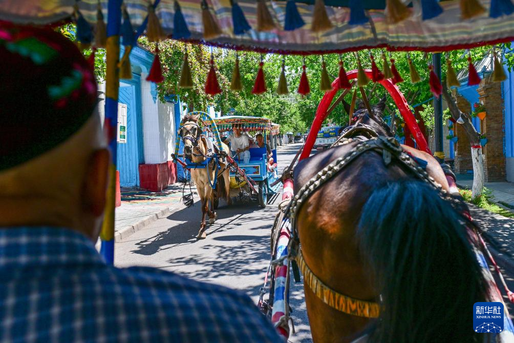 在新疆伊犁哈萨克自治州伊宁市喀赞其民俗旅游区,游客坐着马车观光游览。