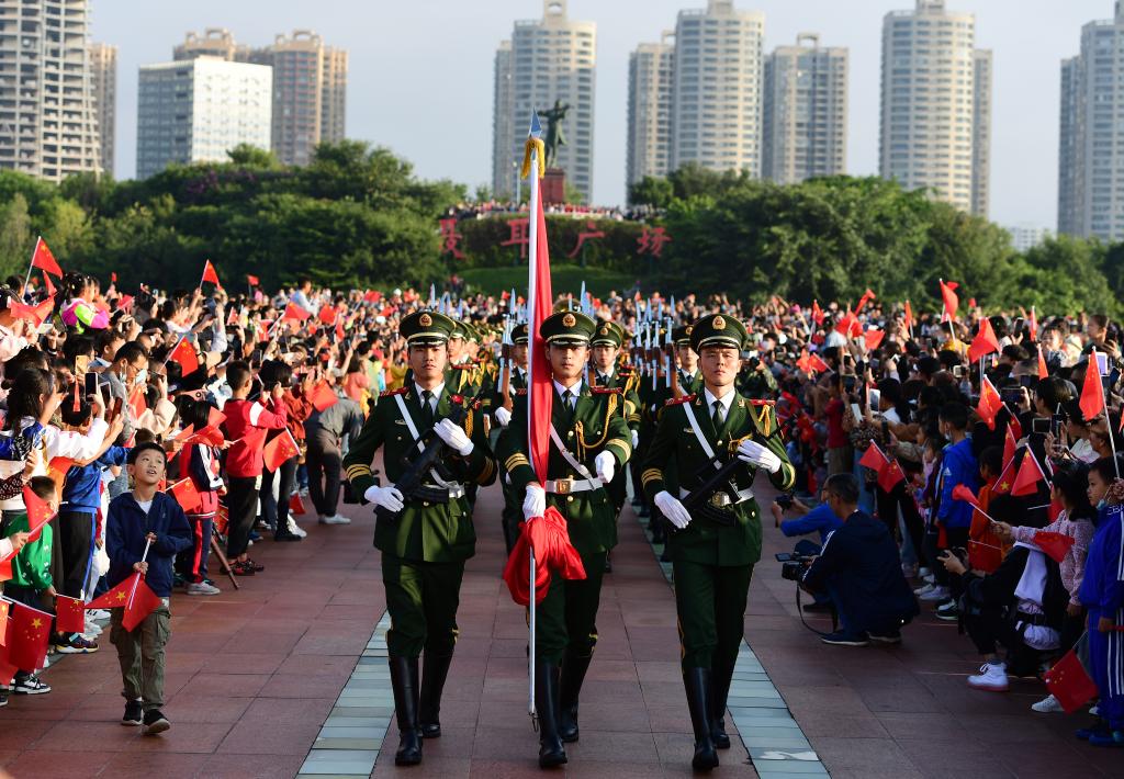 人们在云南省玉溪市聂耳广场参加升国旗仪式。