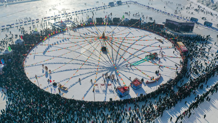 游客观看查干湖冬捕“祭湖醒网”仪式(无人机照片)。