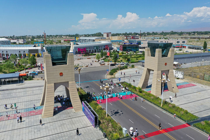 新疆霍尔果斯市中哈霍尔果斯国际边境合作中心拍摄的中哈连接通道。