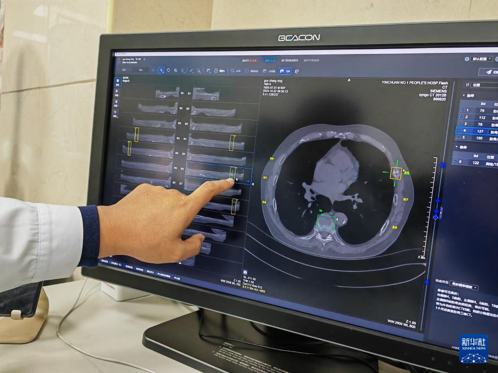 在宁夏回族自治区银川市第一人民医院,放射科副主任医师姜荣兴打开电脑上的人工智能辅助诊断系统,导入病患CT影像资料后,轻点鼠标,系统瞬间完成初筛——24根肋骨逐一呈现在屏幕上,骨折和疑似骨折的部位一目了然。医生再对初筛结果作出诊断处理,全程用时不到4分钟。