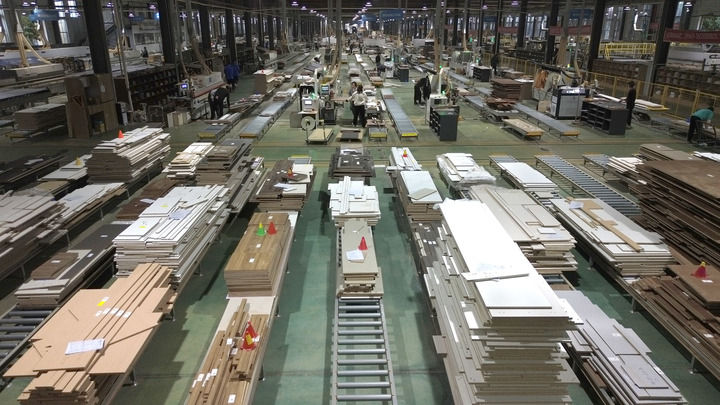 曹县庄寨镇,工作人员在一家全屋定制家具生产企业的生产车间内工作。