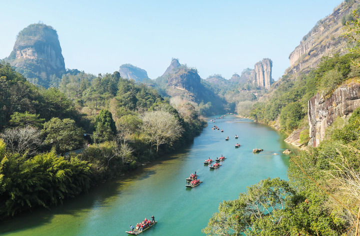 游人乘坐竹筏在福建武夷山国家公园九曲溪漂流。