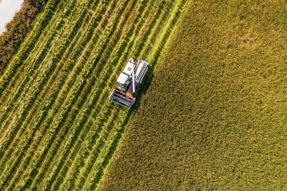 收割机在浙江省湖州市吴兴区东林镇保国村的稻田里作业。