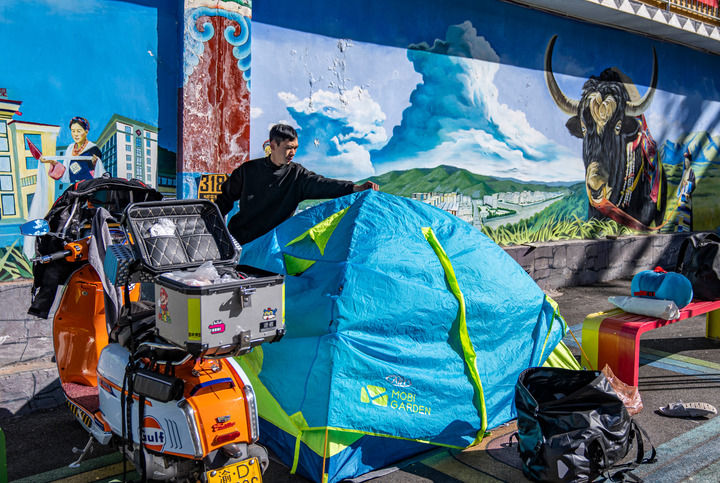 经国道318线前往西藏旅游的重庆游客张静在芒康县如美镇拉乌村整理帐篷。