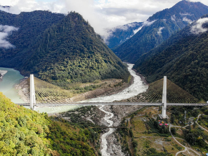 川藏公路通麦路段上的迫龙沟特大桥。迫龙沟特大桥位于西藏林芝市波密县境内,是西藏自治区内最大的公路双塔斜拉桥。