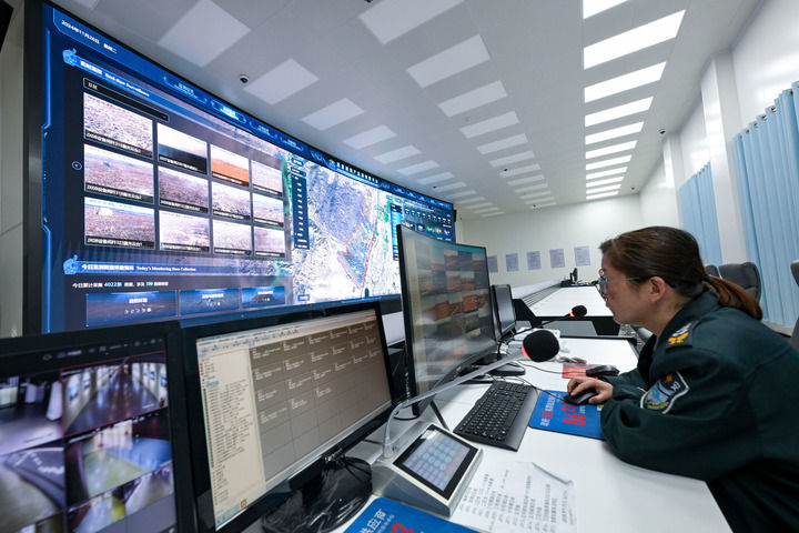 西夏陵博物馆工作人员通过遗址动态信息及监测预警系统查看陵区情况。