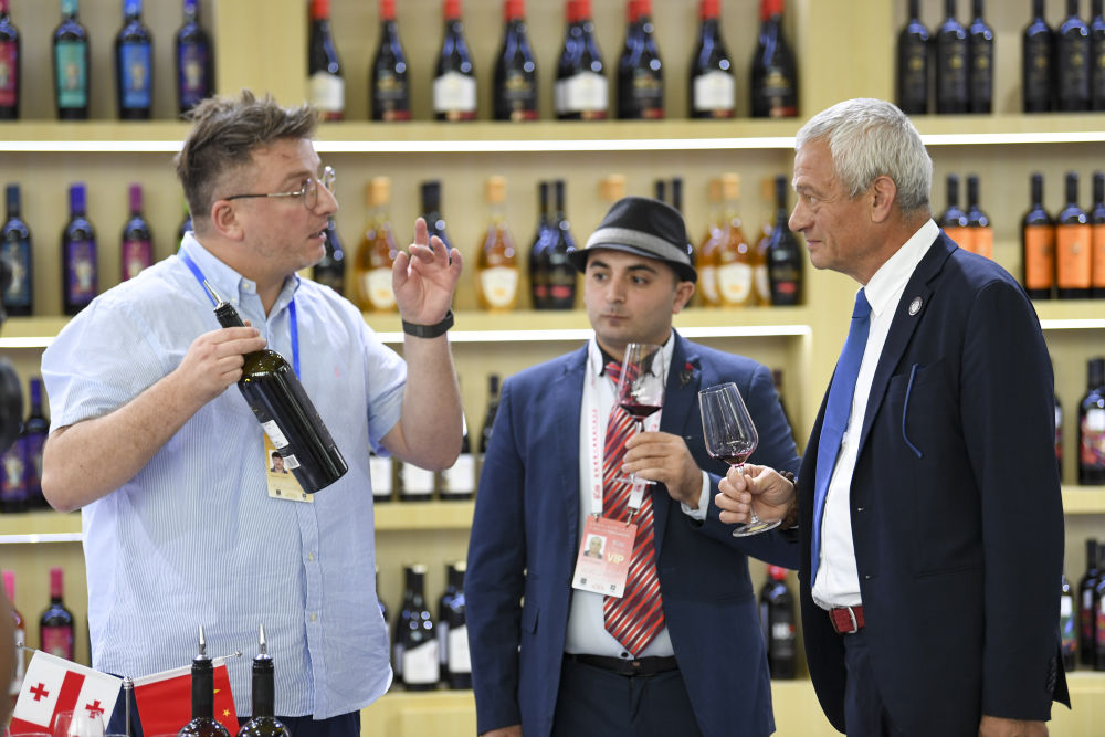 国际葡萄与葡萄酒产业大会、第三届中国(宁夏)国际葡萄酒文化旅游博览会在宁夏银川开幕。这是嘉宾在展会现场品鉴葡萄酒。