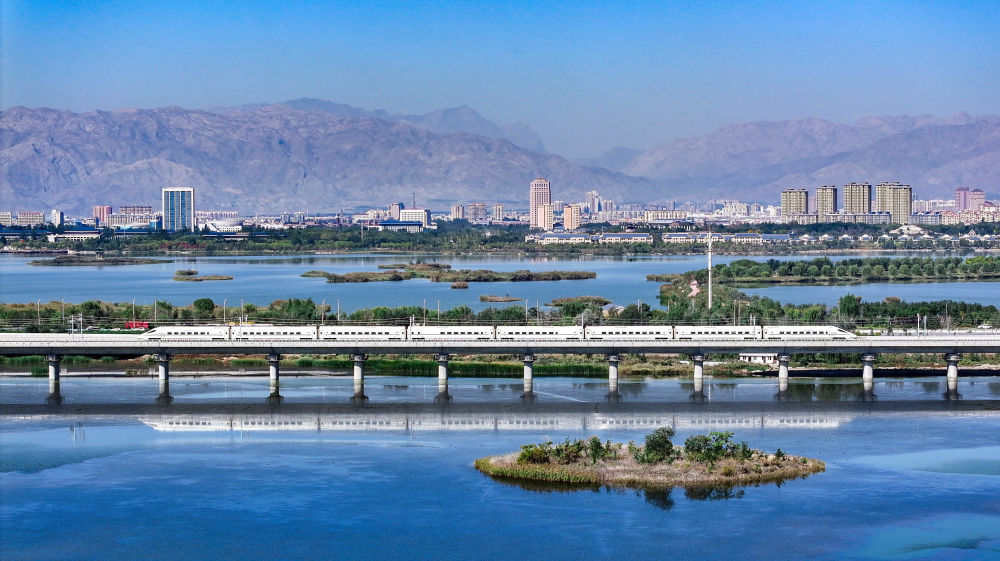 一列动车组列车行驶在包银高铁惠银段石嘴山特大桥上。