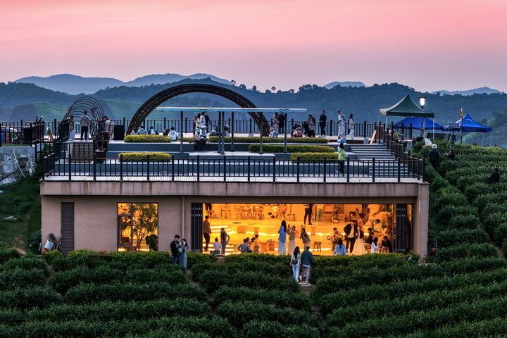 安吉溪龙乡白茶原观景平台及网红咖啡店的游客络绎不绝。
