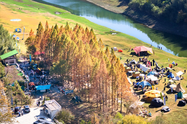 游客在安吉夏阳村的露营地里休闲游玩。