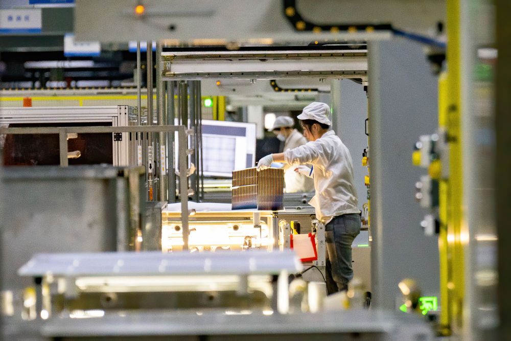 在位于安徽省合肥市肥东县的合肥循环经济示范园内一光伏组件企业车间,工人在生产线上忙碌。