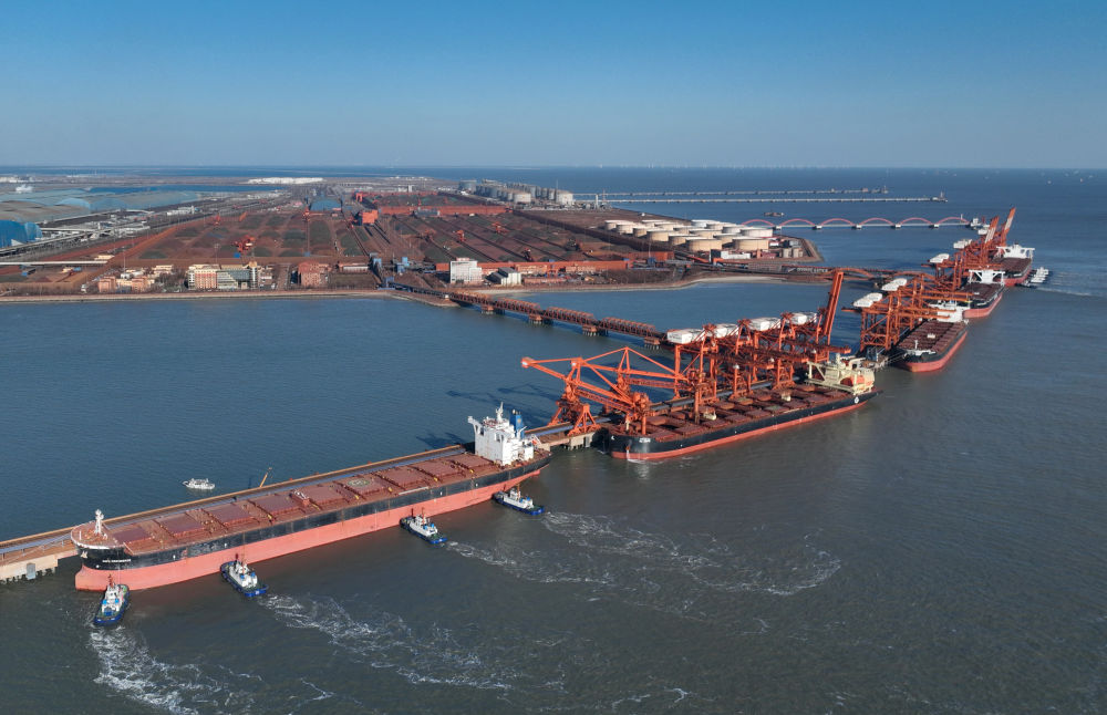 轮船靠泊在河北唐山港曹妃甸港区矿石码头卸载。