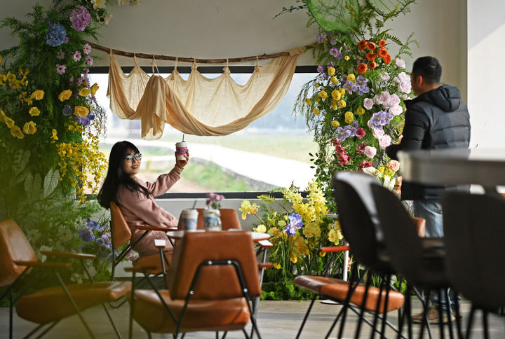 游客在浙江省桐庐县梅蓉村乡村会客厅宏逸咖啡馆拍照打卡。