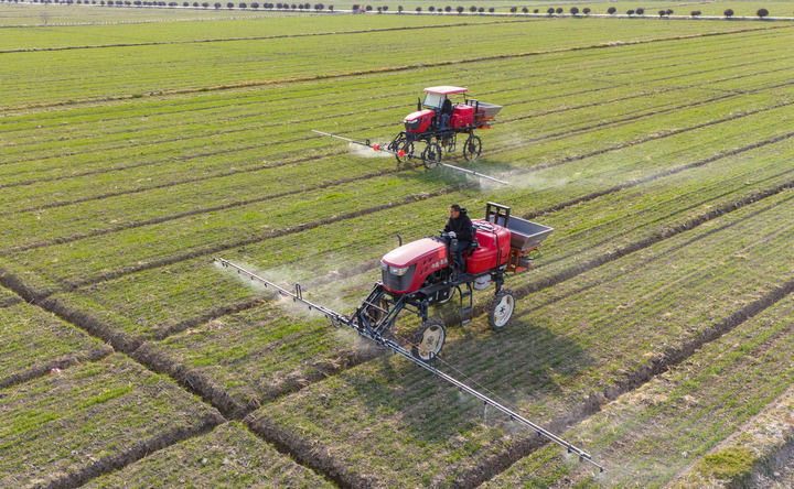 在江苏省南通市通州区十总镇育民村高标准农田,农民驾驶植保机械对进入返青期的小麦开展病虫害防治作业。