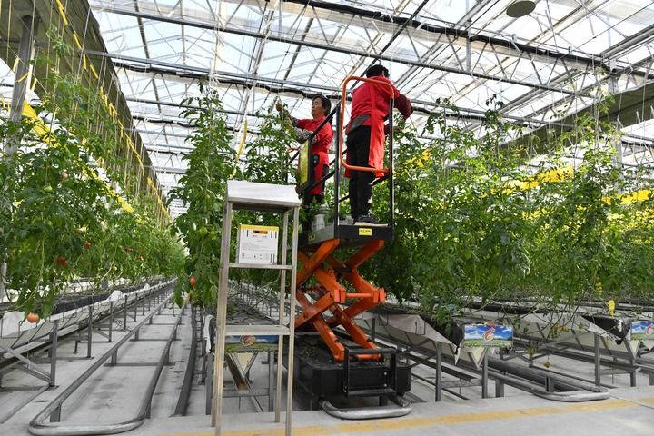 蔬菜种植户在山东省潍坊市寒亭区的智能温室大棚里进行管护作业。