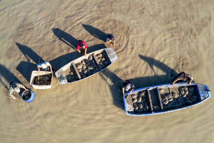 工人在位于湖南省汉寿县的湖南华甲农业集团有限公司生态甲鱼产业园捕捞甲鱼。