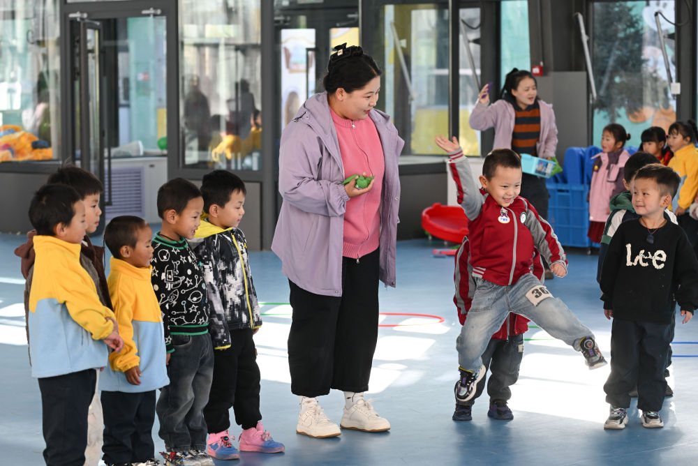 在青海省海西蒙古族藏族自治州天峻县民族幼儿园,小朋友们在老师带领下上体育课。
