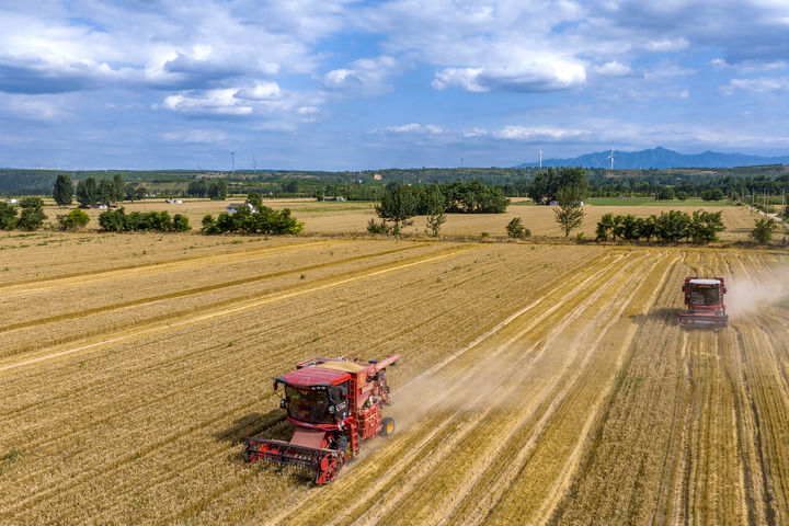 收割机在河南三门峡灵宝市的麦田里收获小麦。