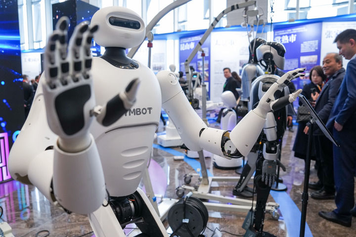在2025年苏州市“人工智能+”创新发展推进大会暨人工智能赋能新型工业化深度行(苏州站)活动现场拍摄的人形机器人。