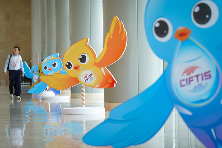 在国家会议中心拍摄的服贸会吉祥物“福燕”形象。