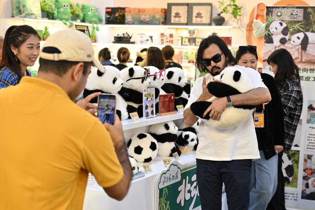 参观者在2024年服贸会首钢园区文旅服务专题展区抱着北京动物园推出的大熊猫文创玩偶合影。