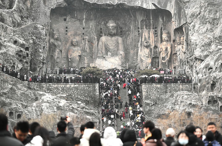 春色正酣。河南洛阳伊水岸畔,龙门石窟游人如织。