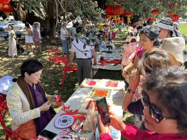 湖北鄂州雕花剪纸省级代表性传承人曹小琴在新西兰向当地民众展示剪纸技艺。