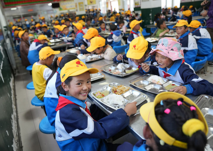西藏林芝市工布江达县娘蒲乡中心小学学生在食堂用餐。