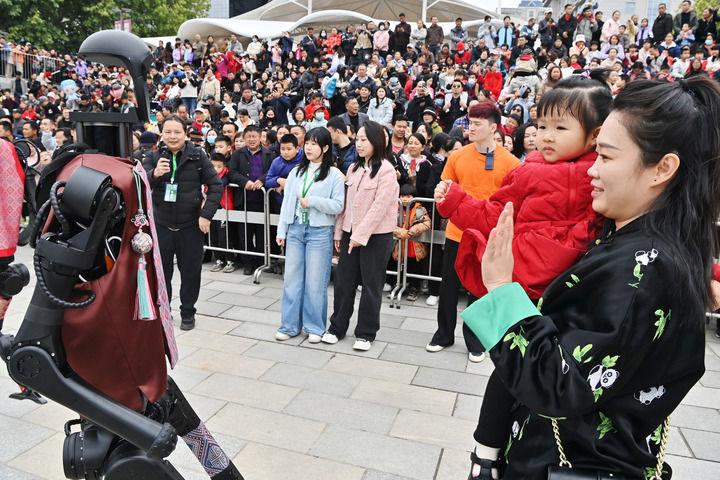 游客在南宁举行的“广西三月三·八桂嘉年华”开幕式现场跟机器人打招呼。