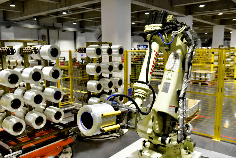 在位于山东省泰安市的泰山玻璃纤维有限公司,工业机器人在搬运玻璃纤维产品。