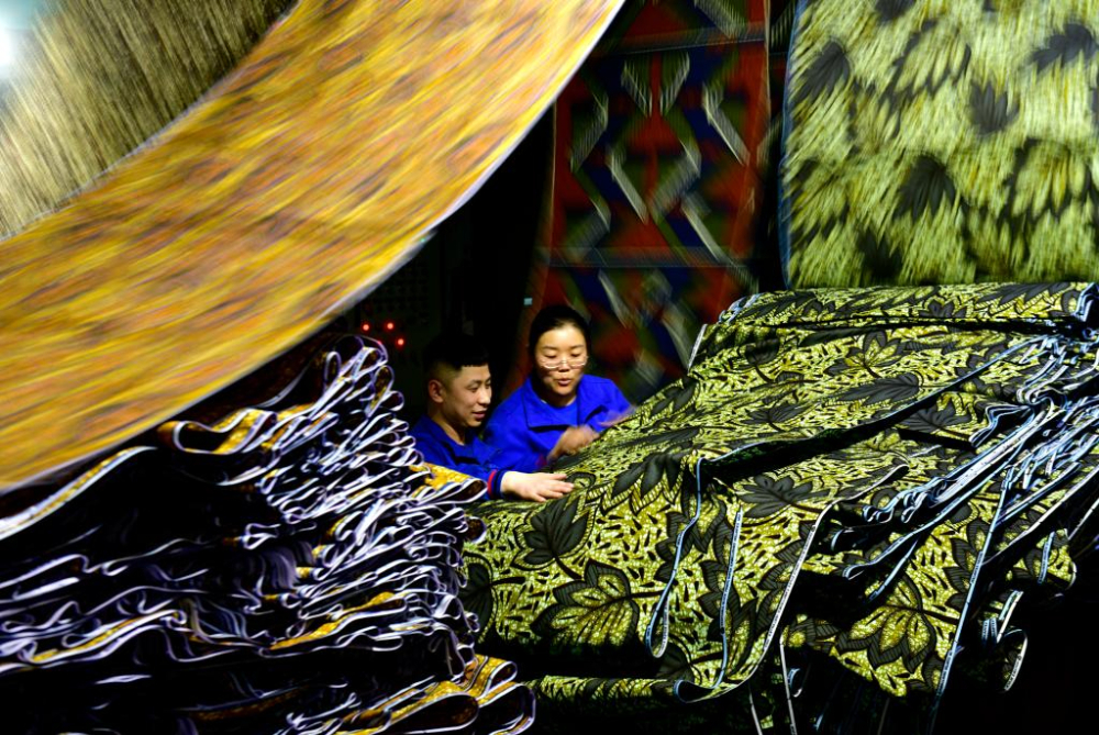 在位于山东省滨州市的愉悦家纺有限公司蜡染车间,工作人员在查看出口布匹。