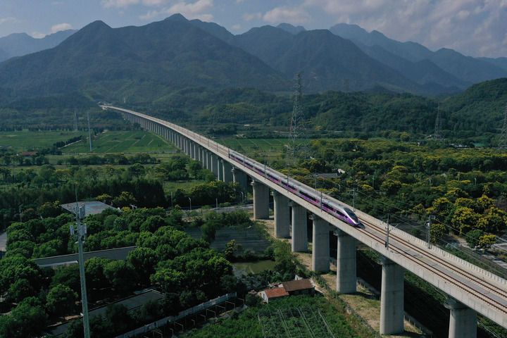 G9505次高铁列车行驶在杭州市桐庐县境内的杭温高铁跨杭黄铁路特大桥上。