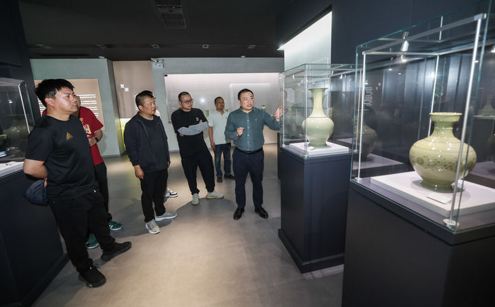 在浙江省慈溪市施山社区施家山公共文化空间的越窑青瓷施珍艺术馆内,文化特派员应周挺(右一)在给参观者介绍青瓷作品。