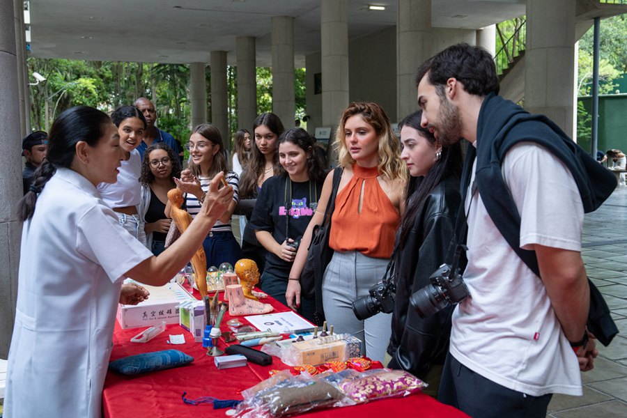在巴西里约热内卢天主教大学举办的“国际中文日”庆祝活动上,学生们观看中医疗法展示。