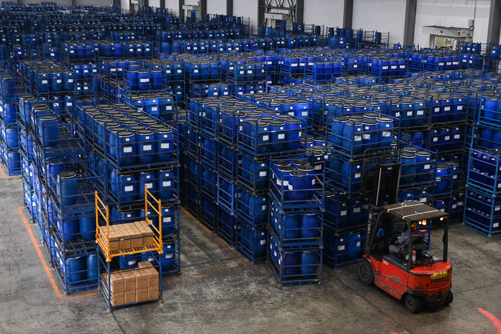 传化集团旗下传化化学大江东基地的产品仓库。