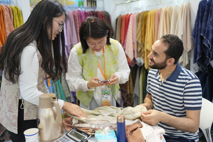 一名来自埃及的客商在2024中国绍兴柯桥国际纺织品面辅料博览会(春季)上选购面料。