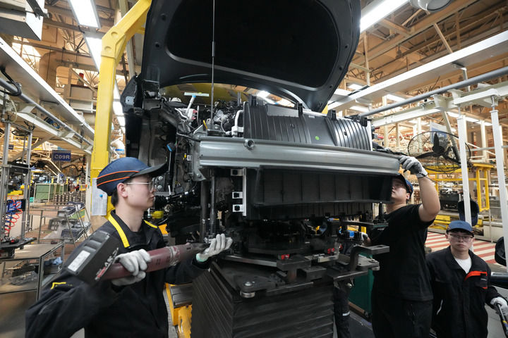 在吉利汽车临海制造基地,工作人员为新能源车安装电池包。