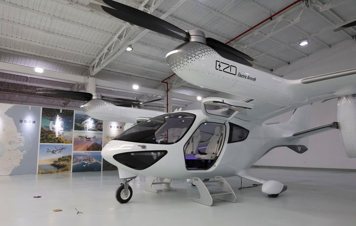 上海时的科技展厅内停放的E20 eVTOL飞机。